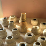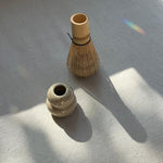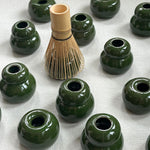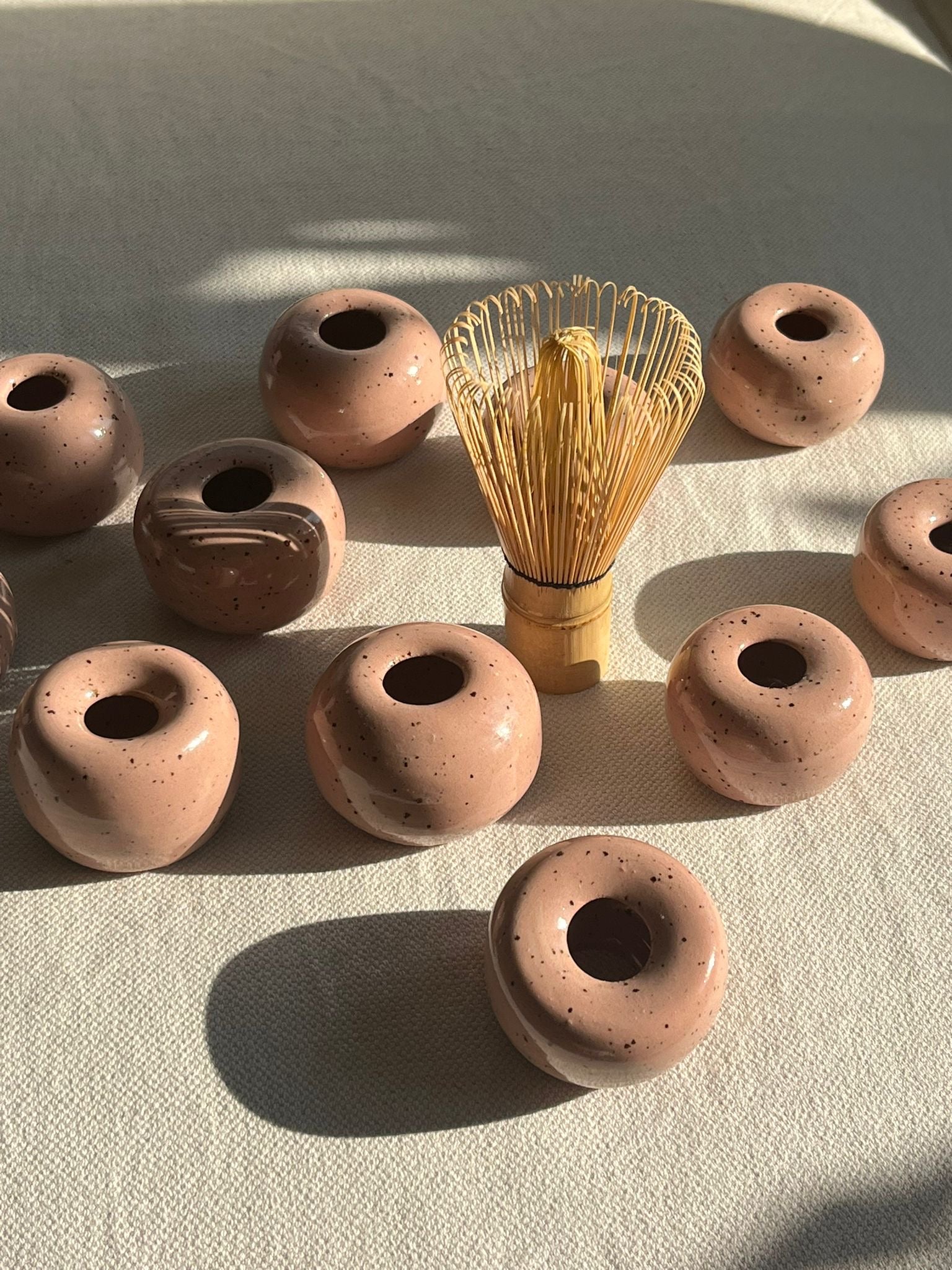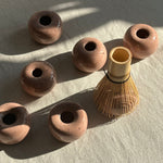 Handmade in stoneware by Alexandra Wiss, these matcha whisk holders are crafted for everyday use and quiet moments of your matcha ritual. Crafted to hold your matcha whisk with care, they come in soft pink, earthy speckled, and deep dark green, available in round or double round forms.